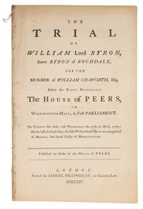 As a peer of the realm, Baron Byron stood trial for murder at Westminster Hall and managed to escape with a mere fine after being convicted of the alernative offence of manslaughter.